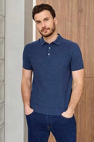 Мужской трикотажный джемпер-поло с короткими рукавами из смеси хлопка, шелка и льна. Хлопок обеспечивает отличную воздухопроницаемость и мягкость на ощупь, шелк добавляет легкий блеск, а лен обладает антисептическими свойствами. Цвет темно-синий. В дизайне использованы вертикальные полосы, визуально вытягивающие силуэт.
