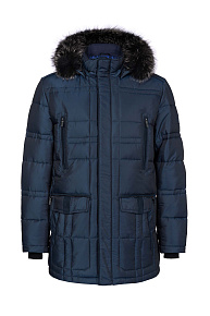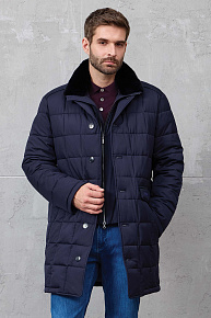 Удлиненный стеганый пуховик с капюшоном и меховой опушкой. Длина по спинке в размере 50: 86 см. Цвет: темно-синий. Застежка на металлическую молнию и кнопки. Планка, позволяющая застегивать кнопки без давления на тело. Воротник-стойка. Съемный капюшон на кнопках, планка убирается в воротник, пата регулирует глубину капюшона, кулиска регулирует объем по краю. Съемная меховая опушка на кнопках. Мех: сноуфрост. По низу боковые разрезы на молниях. 6 внешних карманов: 2 на молнии с клапанами, которые можно убрать внутрь; 2 на молнии, 2 на магнитных застежках, предотвращающих случайное выпадение предметов. 2 внутренних кармана на молнии. Ткань верха с цифровым принтом, защищает от ветра, влаги и холода. Благодаря особым свойствам структуры волокон, способным отводить влагу - между пуховиком и телом поддерживается сухой и теплый микроклимат. Отделка из экокожи. Подкладка из износостойкой ткани. Утеплитель: гусиные пух и перо (90/10%) с высоким показателем Fill Power (700-750), способен удерживать тепло при очень низких температурах.